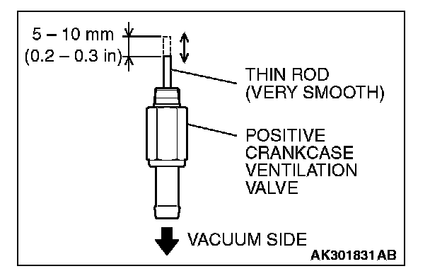 POSITIVE CRANKCASE VENTILATION VALVE CHECK1. Hold the positive crankcase ventilation (PCV) valve with the vacuum side down. Insert a thin rod, and using light pressure, depress the end of the PCV valve spring by 5 - 10 mm (0.2 - 0.3 inch). Release pressure on the rod to see if the PCV valve spring will lift the rod to its original position.