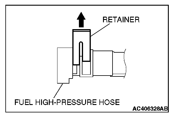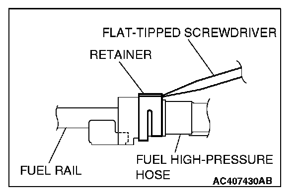 2. Turn the flat-tipped screwdriver approximately 90 degrees to the arrowed direction, and lift the retainer to unlock and disconnect the fuel high-pressure hose.
