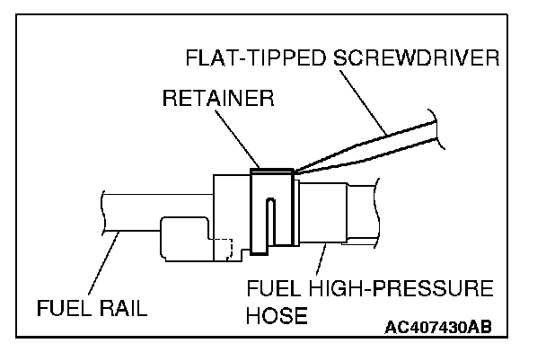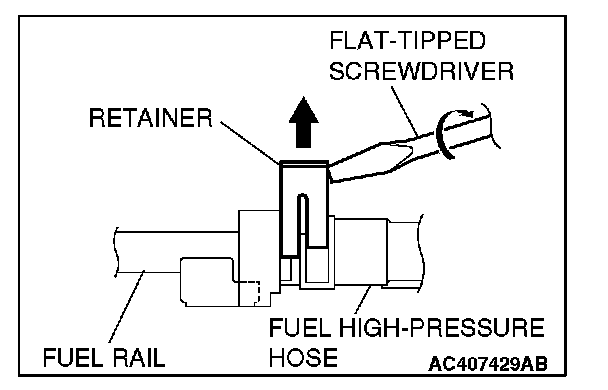 2. Turn the flat-tipped screwdriver approximately 90 degrees to the arrowed direction, and lift the retainer to unlock and disconnect the fuel high-pressure hose.