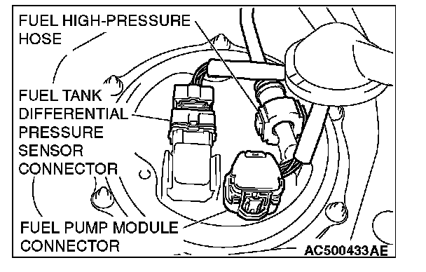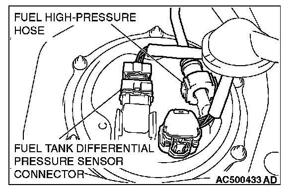 7. Disconnect the fuel tank differential pressure sensor connector and fuel high-pressure hose.