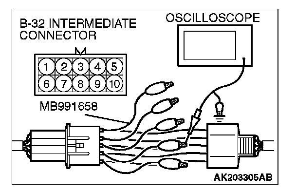 1. Disconnect the intermediate connector B-32, and connect the test harness special tool (MB991658) between the separated connector.