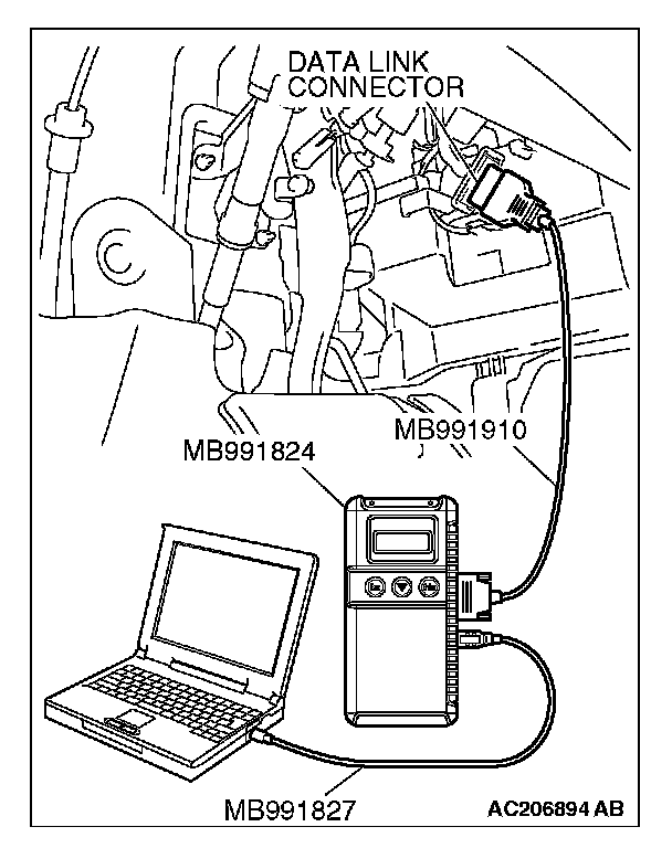 CAUTION: To prevent damage to scan tool MB991958, always turn the ignition switch to the "LOCK" (OFF) position before connecting or disconnecting scan tool MB991958.