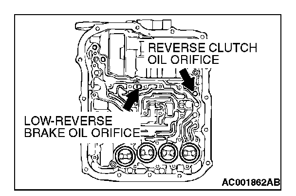 (2) Blow 108 kPa (15 psi) compressed air into the reverse clutch oil orifice of the transaxle case. Then check if the reverse clutch piston moves and air pressures are maintained in that condition. Repeat for the low-reverse brake.