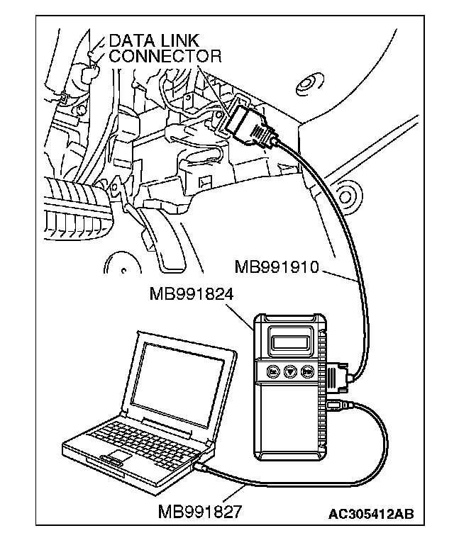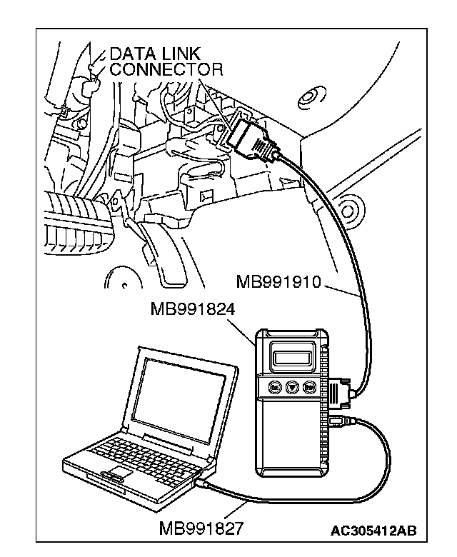 CAUTION: To prevent damage to scan tool MB991958, always turn the ignition switch to the "LOCK" (OFF) position before connecting or disconnecting scan tool MB991958.