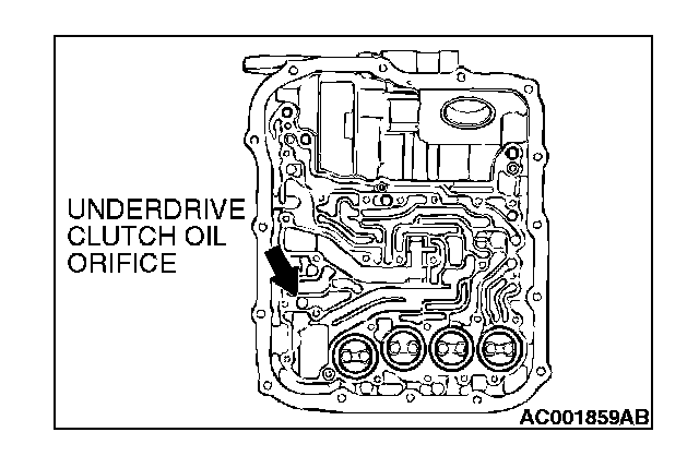(2) Blow 108 kPa (15 psi) compressed air into the underdrive clutch oil orifice of the transaxle case, and check if the underdrive clutch piston moves and air pressure is maintained in that condition.