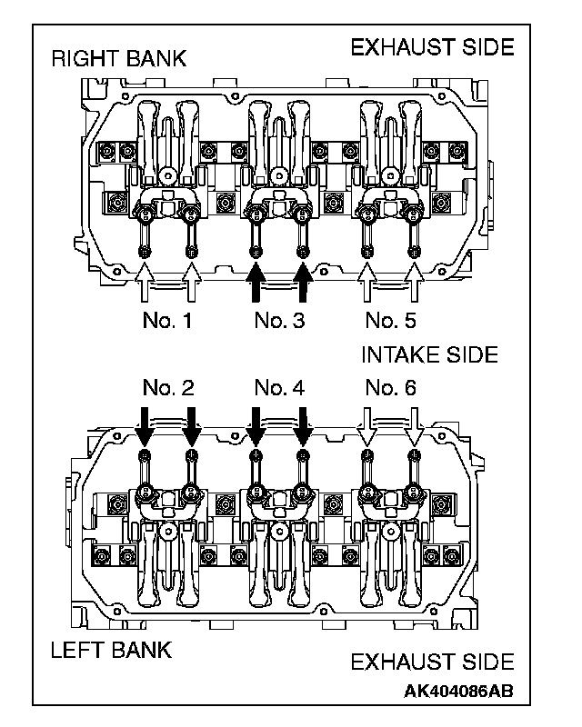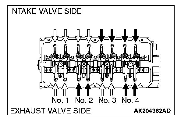 6. Valve clearance inspection and adjustment can be performed on rocker arms indicated by white arrow mark when the No.1 cylinder piston is at the top dead center on the compression stroke, and on rocker arms indicated by black arrow mark when the No.4 cylinder piston is at the top dead center on the compression stroke.
