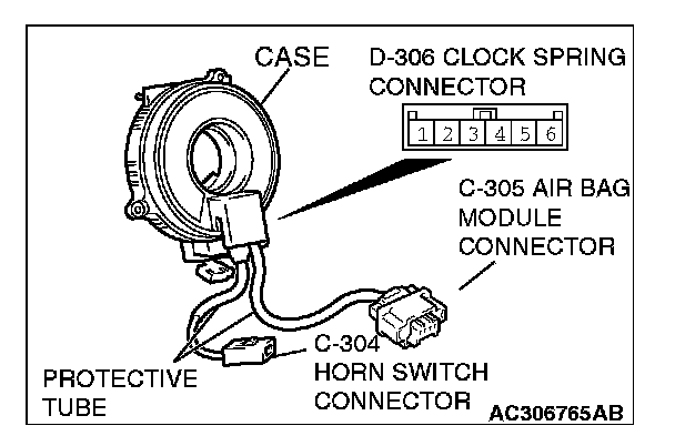 3. Check to see that there is a charge (continuity) between the C-306 clock spring connector terminal 1 and C-304 horn switch.