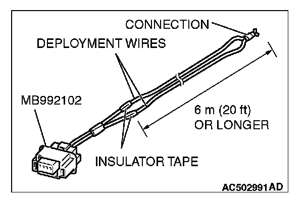 3. Connect deployment wires, each 6 meters (20 feet) or longer, to the two leads of special tool MB992102, and cover the connections with insulator tape. The other ends of the deployment wires should be connected to each other (short-circuited), to prevent sudden unexpected deployment of the air bag module.