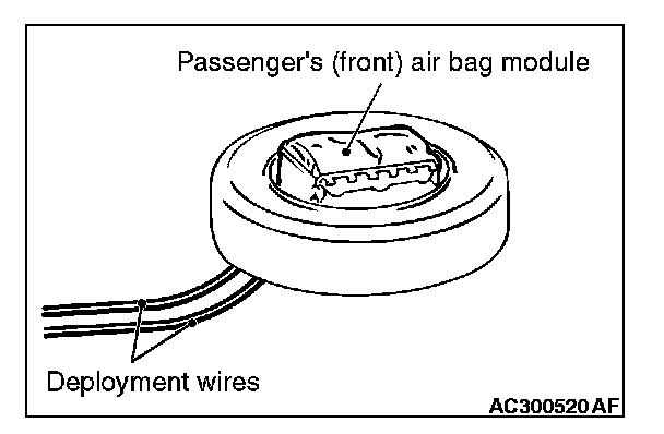 CAUTION: Once disconnected, both electrodes of the passenger's (front) air bag module connector short automatically to prevent accidental deployment caused by static etc. Still, in consideration of possible accidental deployment, store the air bag module on flat place with deployment surface facing up. Do not put anything on it.