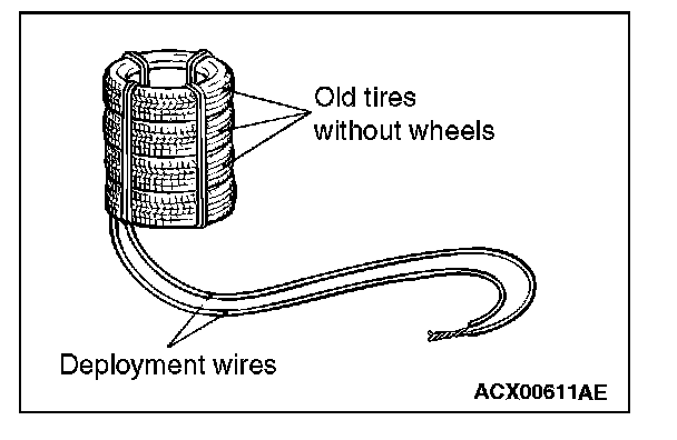 6. Place three old tires without wheels on top of the tire secured to the air bag module, and secure all tires together with ropes (four locations).