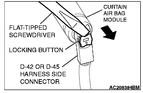 3. Disconnect harness side connector D-42 or D-45 (two-pin, black) from the curtain air bag module.