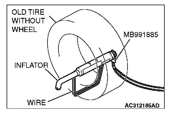 5. Pass the thick wire through the hole of air bag module mounting bracket. When, with the air bag module deployment surface facing upward, fit the module to the old tire with wheel.