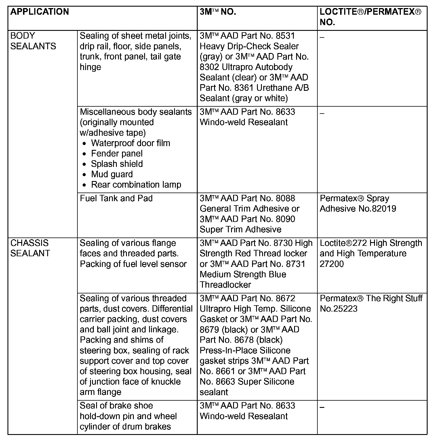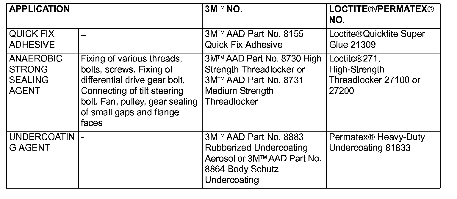 MAIN SEALANT AND ADHESIVE TABLE