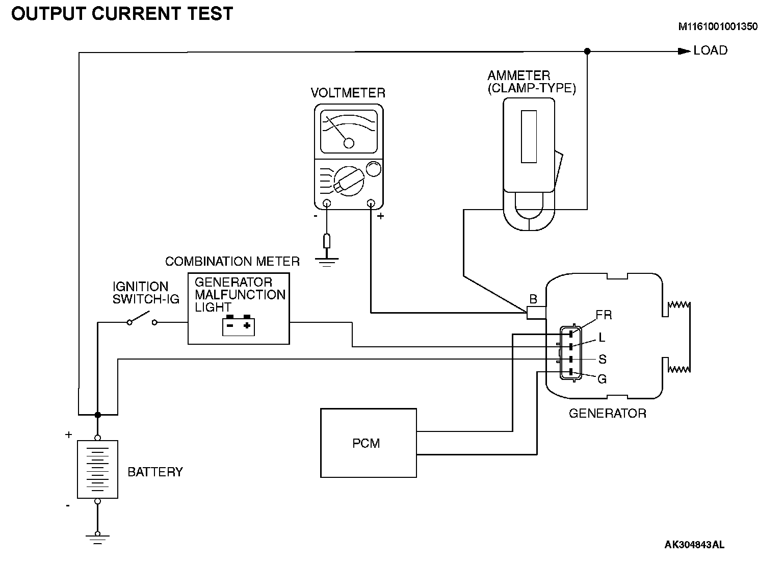 - If the electrical load is small while testing, the specified level of current may not be output even though the generator is normal. In such cases, increase the electrical load by leaving the headlights turned on for some time to discharge the battery or by using the lighting system in another vehicle, and then test again.