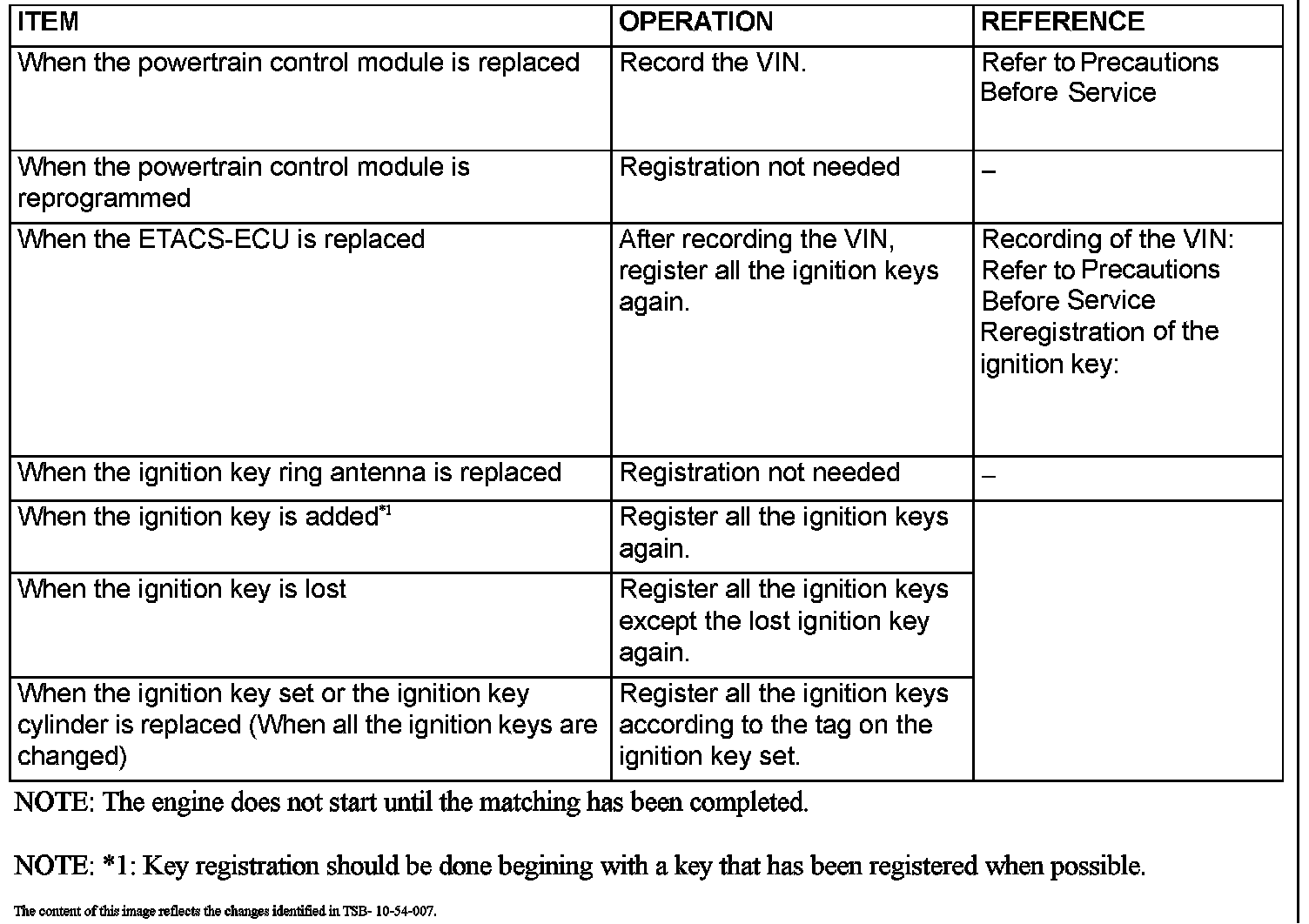 ENCRYPTED CODE REGISTRATION CRITERIA TABLECAUTION: Do not replace the powertrain control module and the ETACS-ECU simultaneously. Always replace either one of the ECUs first, and register the encrypted code. Then, replace the other ECU.