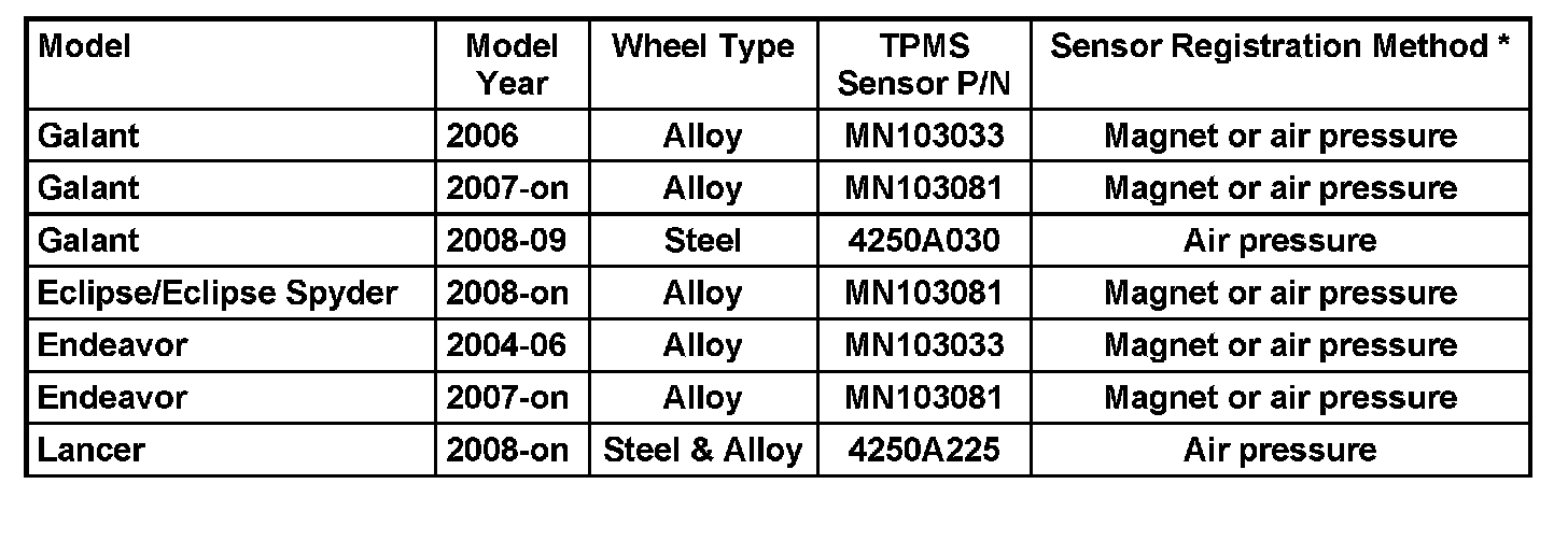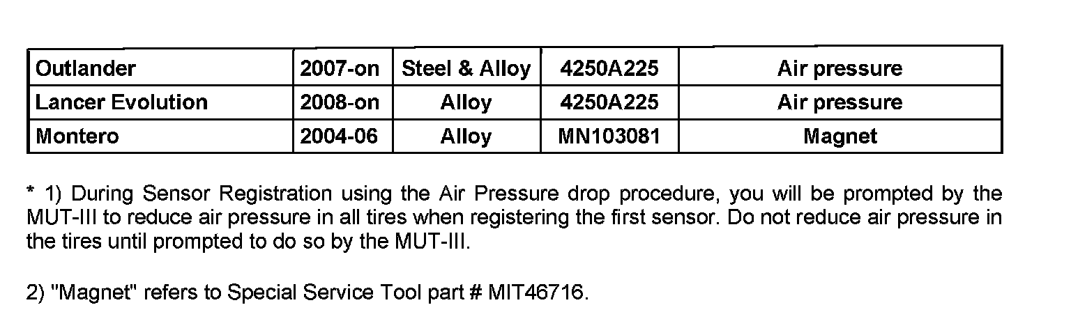 Replacement TPMS sensors are activated by the factory and require only registration to the vehicle they are being installed on. Additionally if tires are switched between vehicles the sensors must be reregistered to BOTH vehicles. DTCs will be set if they are not. The MUT-III is required to register TPMS sensors.