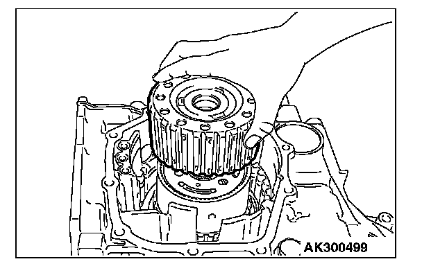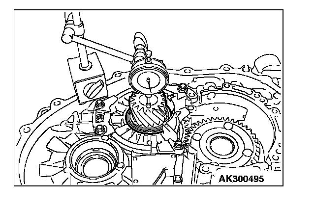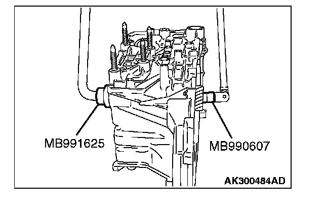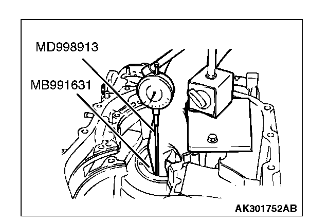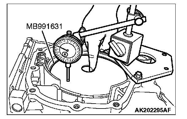 18. Turn the transaxle over so that the installation surface of the torque converter housing is facing up. Install special tool MD998913 in a dial gauge, and then move special tool MB991631 and measure its movement.