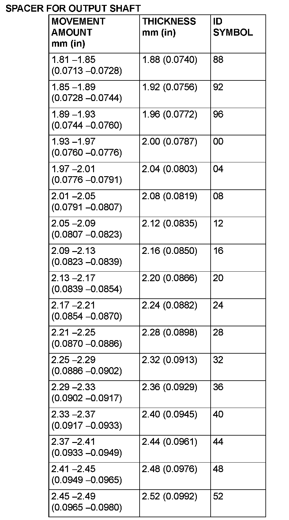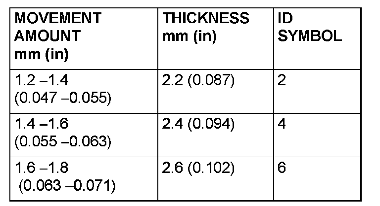 28. Select a spacer whose thickness corresponds to the measured amount of movement from the following table.