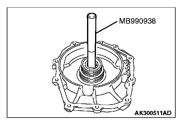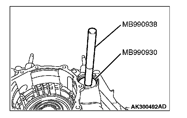 22. Use special tools MB990930 and MB990938 to tap the output shaft bearing outer race in the transaxle case.