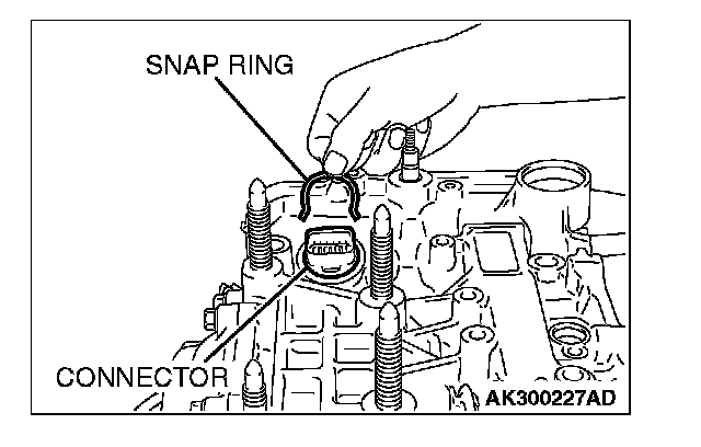 80. Insert the solenoid valve harness connector into the hole from the inside of the transaxle case so it is oriented as shown in the illustration. Then secure the snap ring to the connector groove.