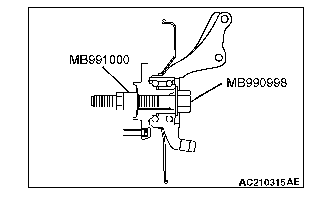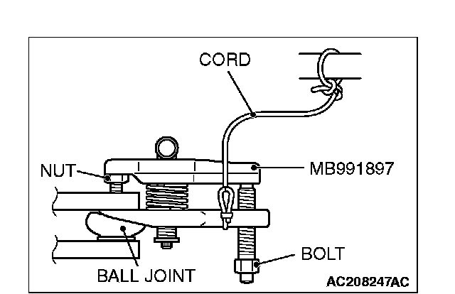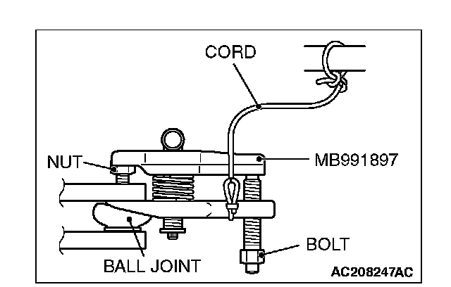 1. Replace the self locking nut with a regular nut, because the original one is a little bit large to install the special tool. Install special tool MB991897 as shown in the figure.