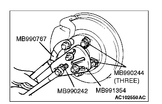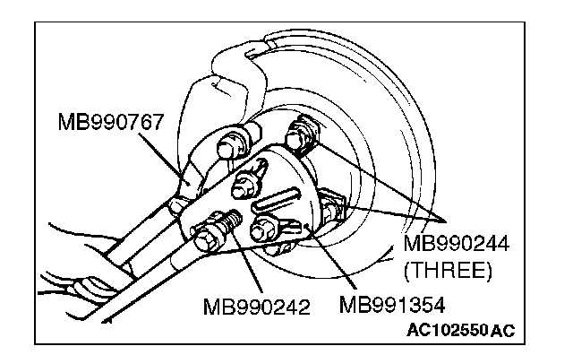 1. Use special tools MB990242, MB990244, MB991354 and MB990767 to push out the drive shaft or the drive shaft and inner shaft assembly from the hub.