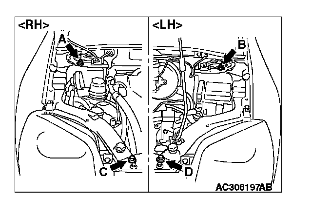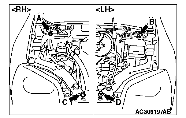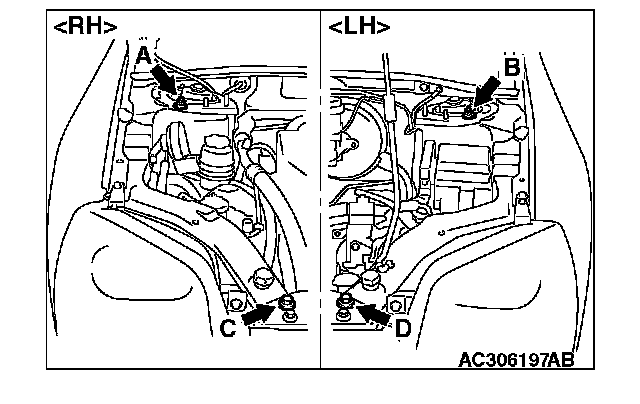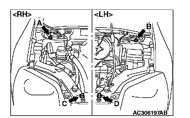 (1) Set special tool MB991895 (engine hanger) to the front fender assembling bolts (A and B) and (C and D), which are located in the engine compartment, as shown.
