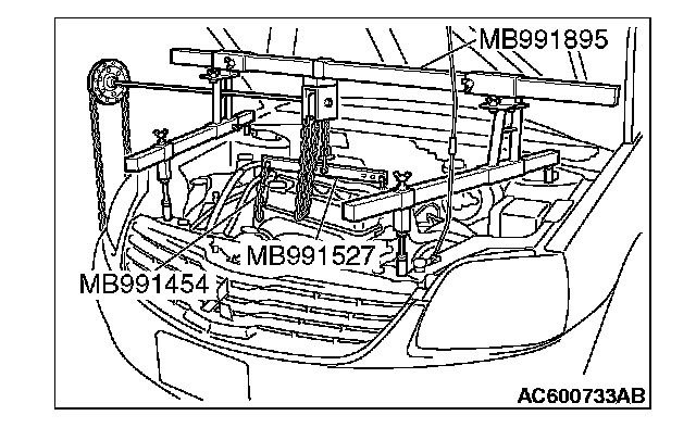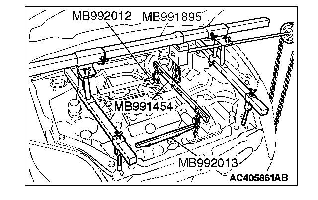 (2) Set special tool MB991527 and MB991454 (chain) to hold the engine/transaxle assembly.