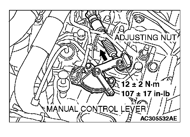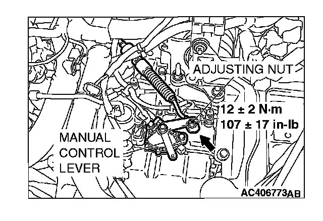 2. Place the cable stud into the manual control lever slot and install the nut loosely. Gently push the transaxle control cable into the manual control lever slot until the cable is taut. Tighten the nut to the specified torque.
