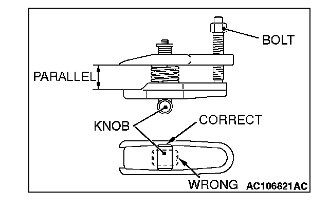 2. Turn the bolt and knob as necessary to make the jaws of special tool MB991897 parallel, tighten the bolt by hand and confirm that the jaws are still parallel.