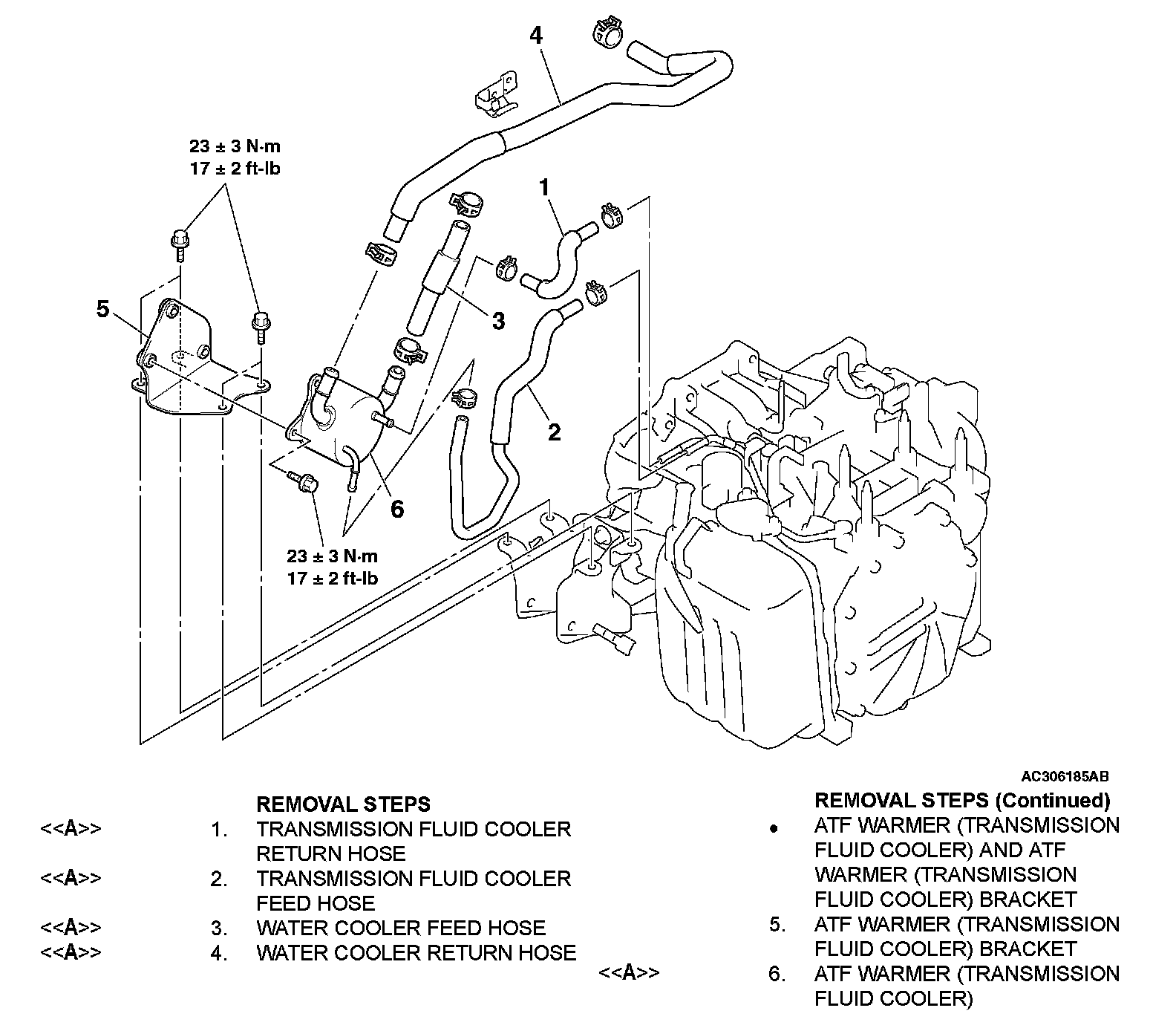 [[A]] TRANSMISSION FLUID COOLER RETURN HOSE/TRANSMISSION FLUID COOLER FEED HOSE/WATER COOLER FEED HOSE/WATER COOLER RETURN HOSE/ATF WARMER (TRANSMISSION FLUID COOLER) REMOVAL