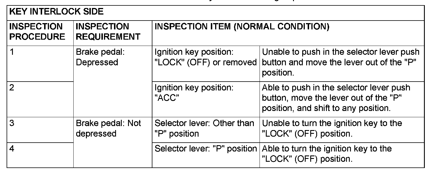 KEY INTERLOCK AND SHIFT LOCK MECHANISM CHECK1. Carry out the following inspection.