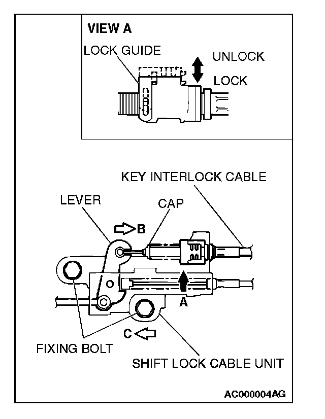 (4) Loosen the bolt fixing the shift lock cable unit, push the lever in direction B and the unit in direction C and tighten the bolt at the standard torque.
