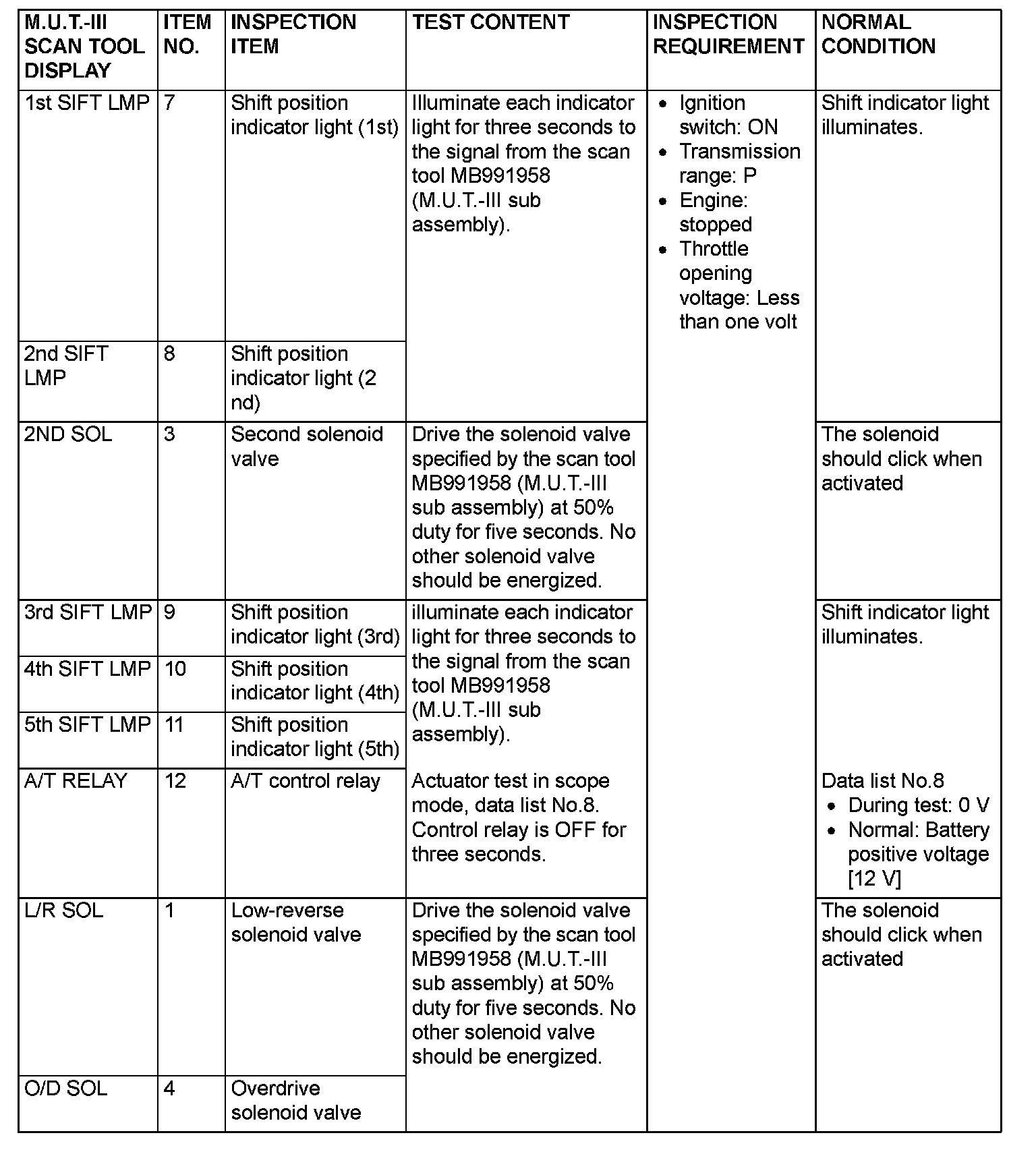 Actuator Test Reference Table (Part 2):