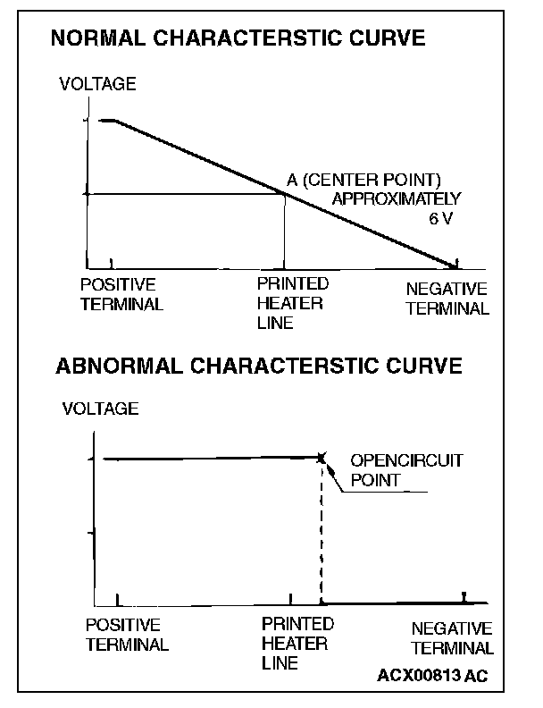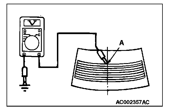 2. Turn "ON" the rear window defogger switch. Measure the heater element voltage with an ohmmeter at the rear window glass center A. Condition is good if it indicates about 6 V.