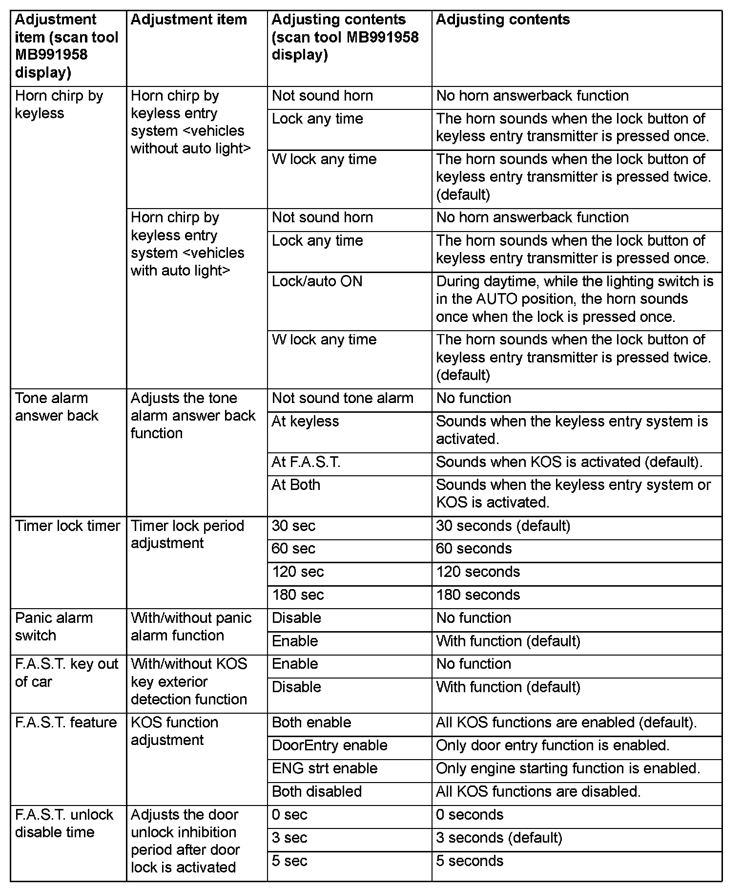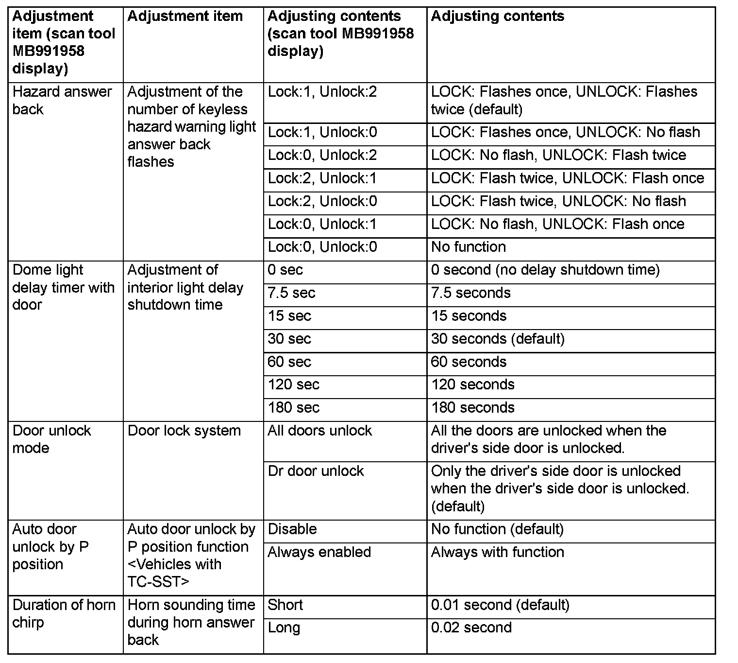 By operating the ETACS system or MMCS of scantool MB991958, the following functions can be programmed. The programmed information is held even when the battery is disconnected.