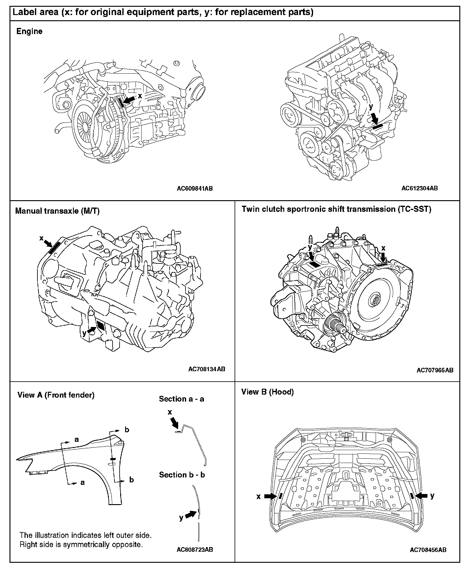 When replacing a part that has the theft protection plate, label or stamp on it, be sure that the part has either A or B shown in the figure. It is illegal if both A and B are attached, or neither A nor B is attached.