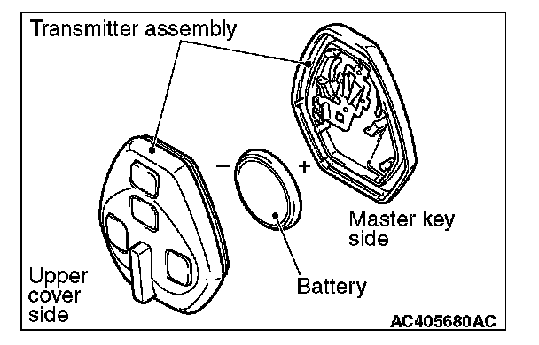 Install a new battery to the transmitter assembly with its (+) side facing towards the master key side.