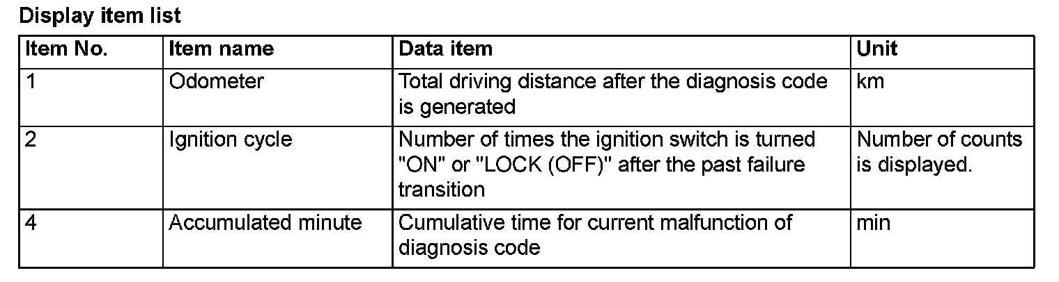 When detecting fault and storing the diagnosis code, the ECU connected to CAN bus line obtains the data before the determination of the diagnosis code and the data when the diagnosis code is determined, and then stores the ECU status of that time. By analysing each data from scan tool MB991958(M.U.T.-III sub assembly), the troubleshooting can be performed more efficiently. The displayed items are as the table below.