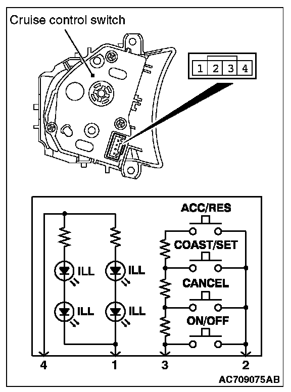 3. Check for continuity between the between terminal number 1 and terminal number 4 of the cruise control switch.
