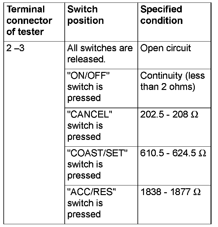 2. Measure the resistance between terminal number 2 and terminal number 3 when each of the "ON/OFF", "CANCEL" "COAST/SET" and "ACC/RES" switches is pressed. If the values measured at the time each switch is pressed correspond to those in the table given, the resistance values are correct.