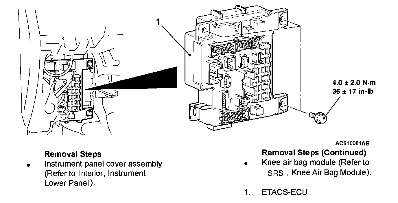 - Before removing the ETACS-ECU and knee air bag module, refer to SRS, Service Precautions and Knee Air Bag Module.