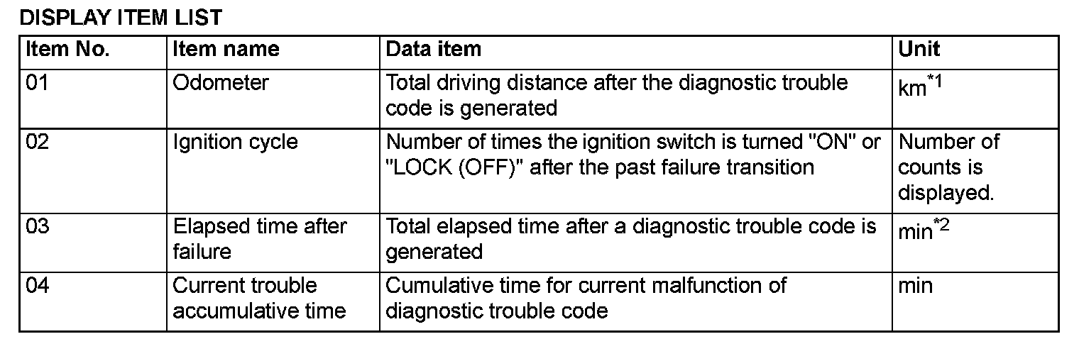 -*2: Total elapsed time can be stored up to 65,534 minutes (45.5 days). The display of scan tool is fixed to 65,534 minutes after 65,534 minutes have elapsed. Or, if the battery is disconnected, the total elapsed time cannot be measured properly. Thus, 65,535 minutes (null value) is displayed. Because it is calculated based on the ETACS-ECU information, the correct display may not be shown if the ETACS-ECU has had a timeout.