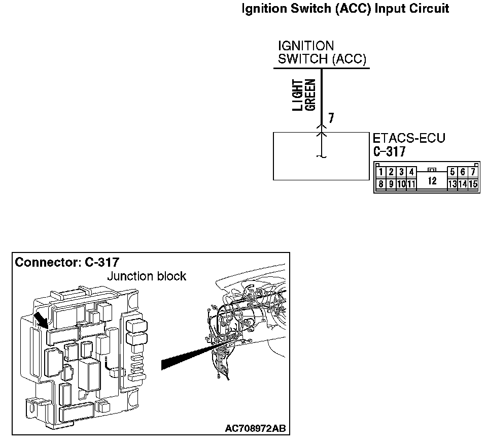 Q : Is the wiring harness between ETACS-ECU connector C-317 (terminal 7) and ignition switch (ACC) in good condition?