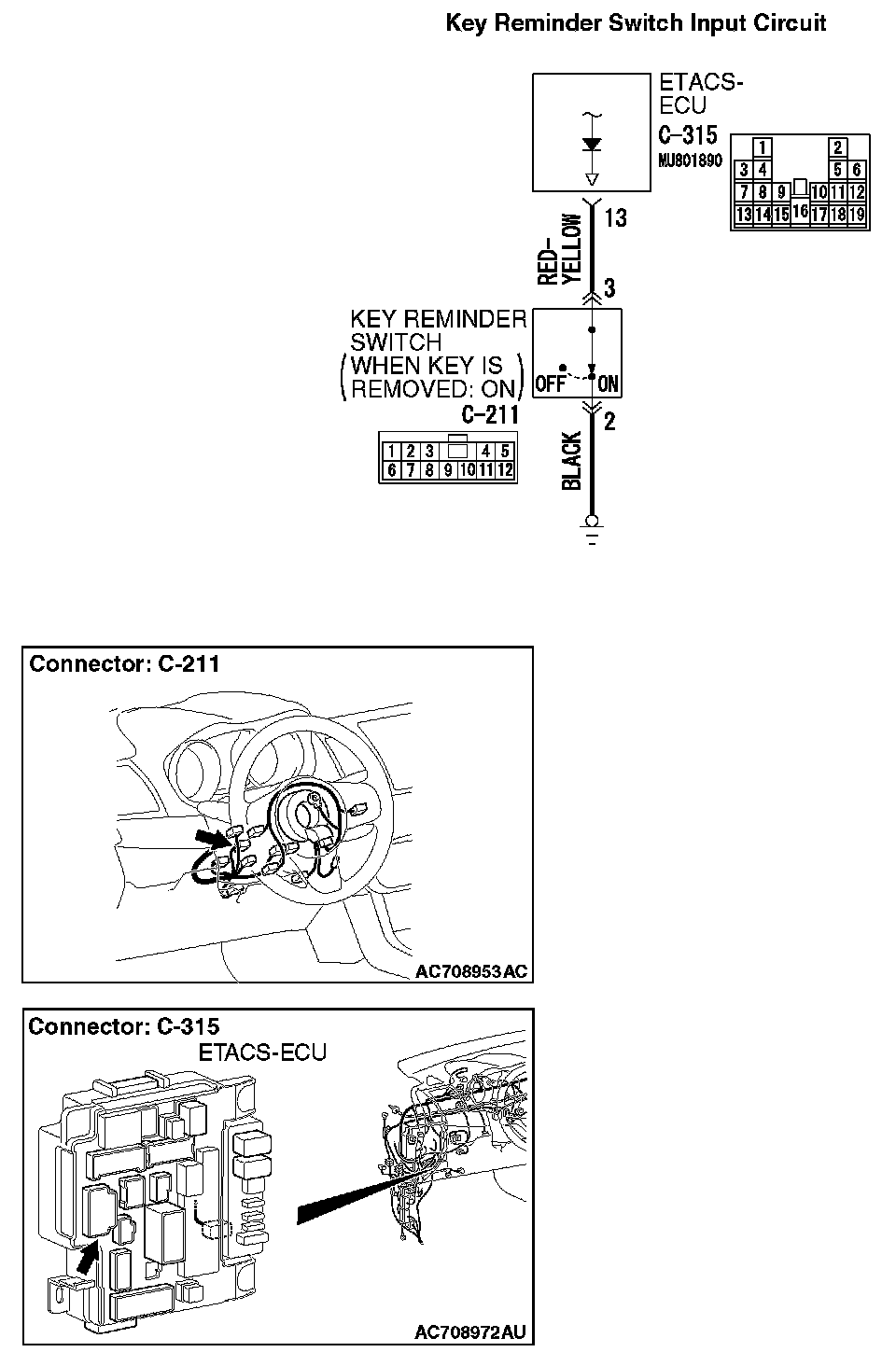 STEP 6. Check the wiring harness between key reminder switch connector C-211 (terminal 3) and ETACS-ECU connector C-315 (terminal 13). Check the output lines for open circuit and short circuit.