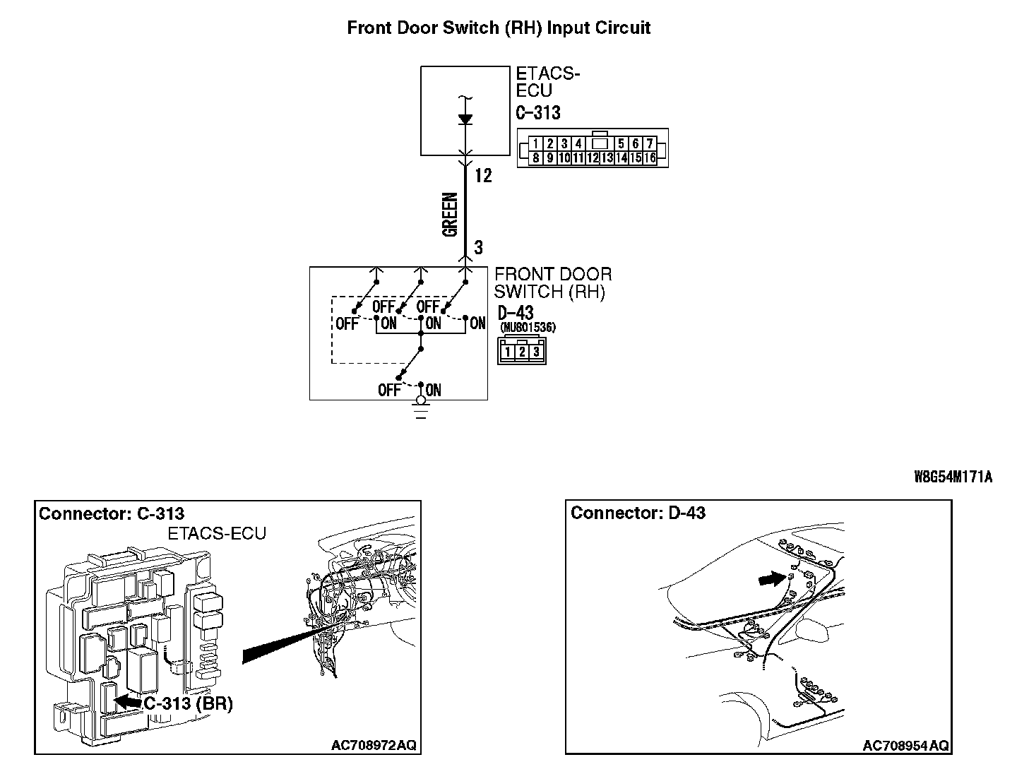 STEP 5. Check the wiring harness between front door switch (RH) connector D-43 (terminal 3) and ETACS-ECU connector C-313 (terminal 12).
