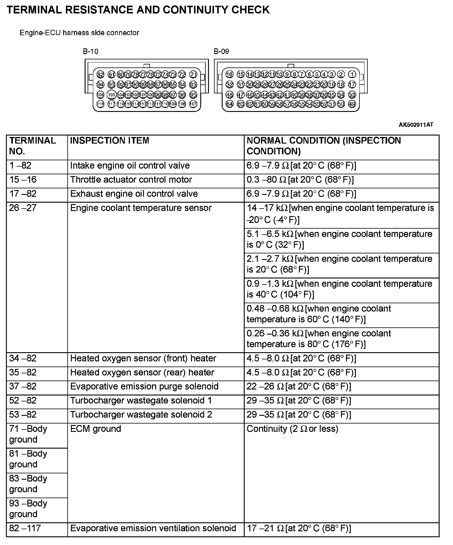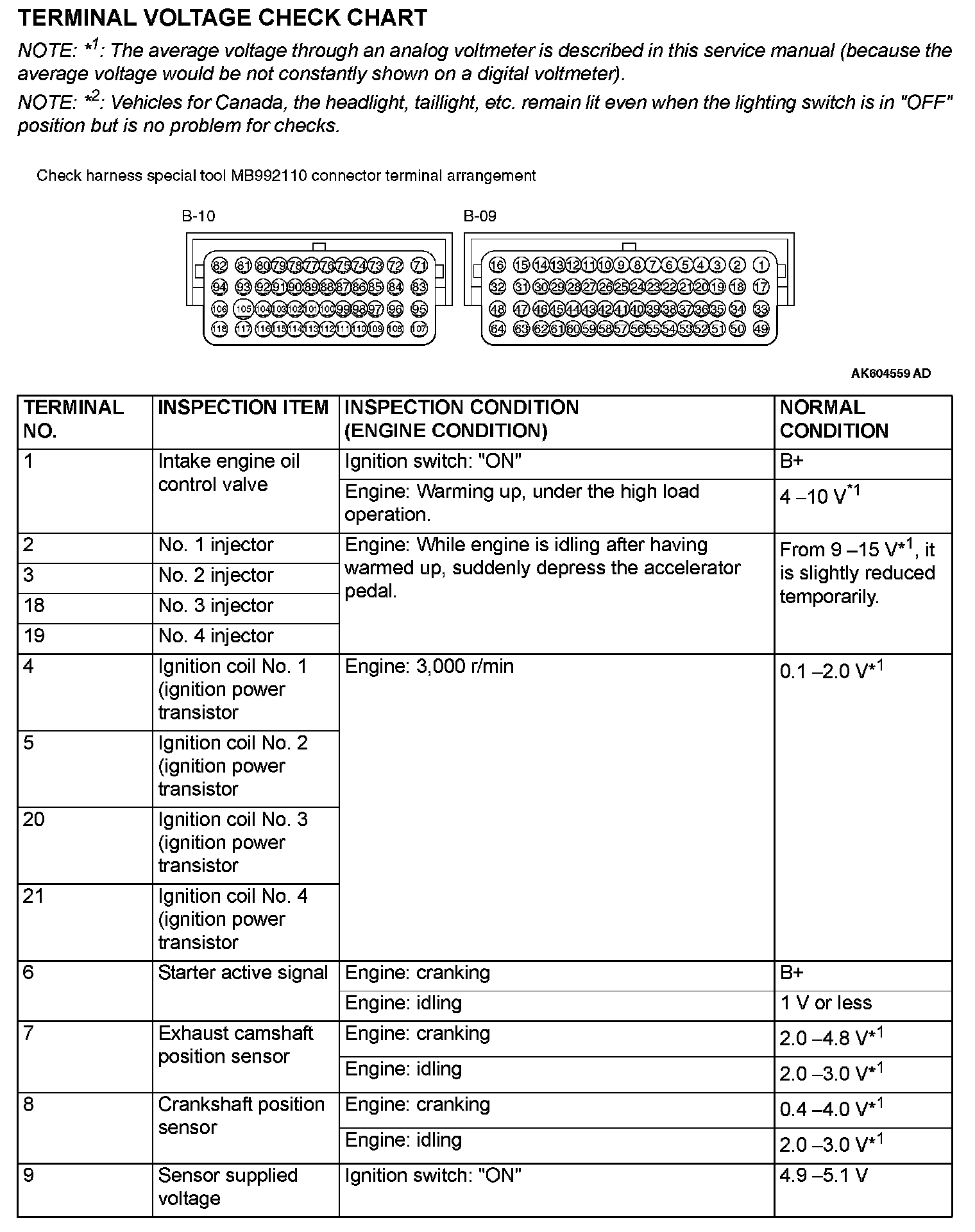 CHECK AT THE ENGINE CONTROL MODULE (ECM)1. Disconnect the ECM connectors B-09 and B-10, and connect check harness special tool MB992110 between the ECM connectors.