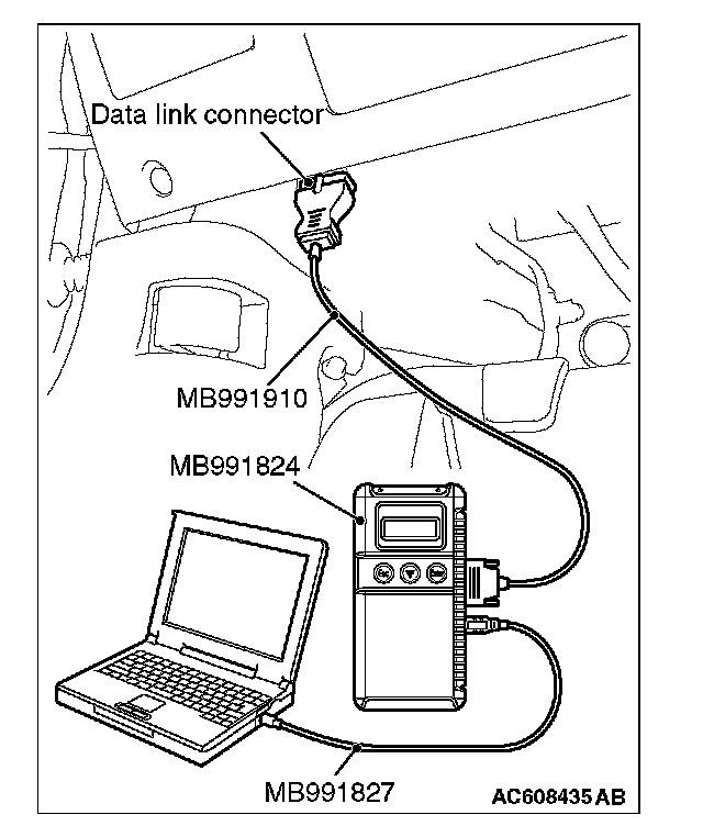 1. After the ignition switch is in "LOCK" (OFF) position, connect scan tool MB991958 to the diagnosis connector.