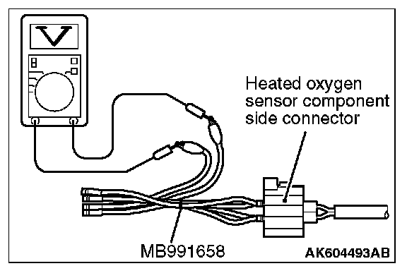 1. Disconnect the heated oxygen sensor connector and connect special tool MB991658 to the connector on the heated oxygen sensor side.