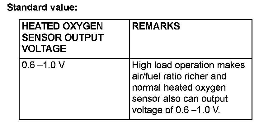 - If the temperature of sensing area does not reach the high temperature [of approximately 400 °C (752 °F) or more] even though the oxygen sensor is normal, the output voltage would be possibly low in spite of the rich air-fuel ratio.